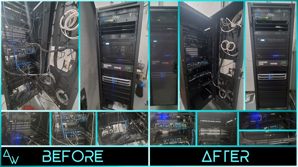 After: Cables Labeled / Screws Added and Replaced / Proper Cable Management / Cleaned Up Brick Dust / Easy Access to Devices